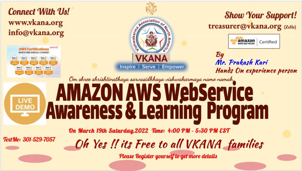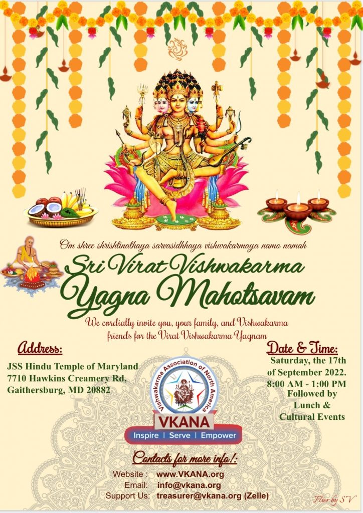 VKANA (Vishwakarma Association of North America) is a registered non-profit social and cultural association based in North America. VKANA was formed by the voluntary Vishwakarma followers to help underprivileged members of the community in the areas of education, business development and health as well as senior citizen care. VKANA encourages everyone to volunteer to come forward to help the Vishwakarma families. The goal of VKANA is also to promote and educate about Lord Sri Vishwakarma.